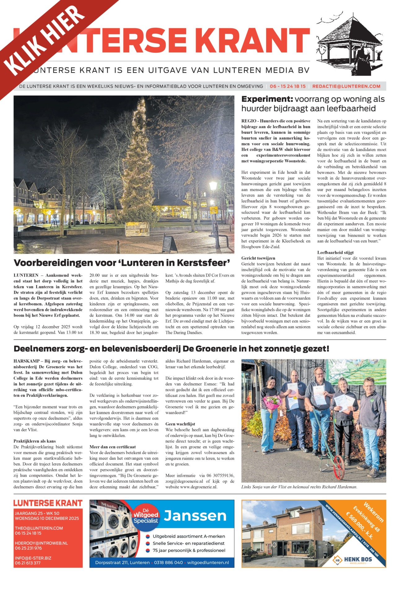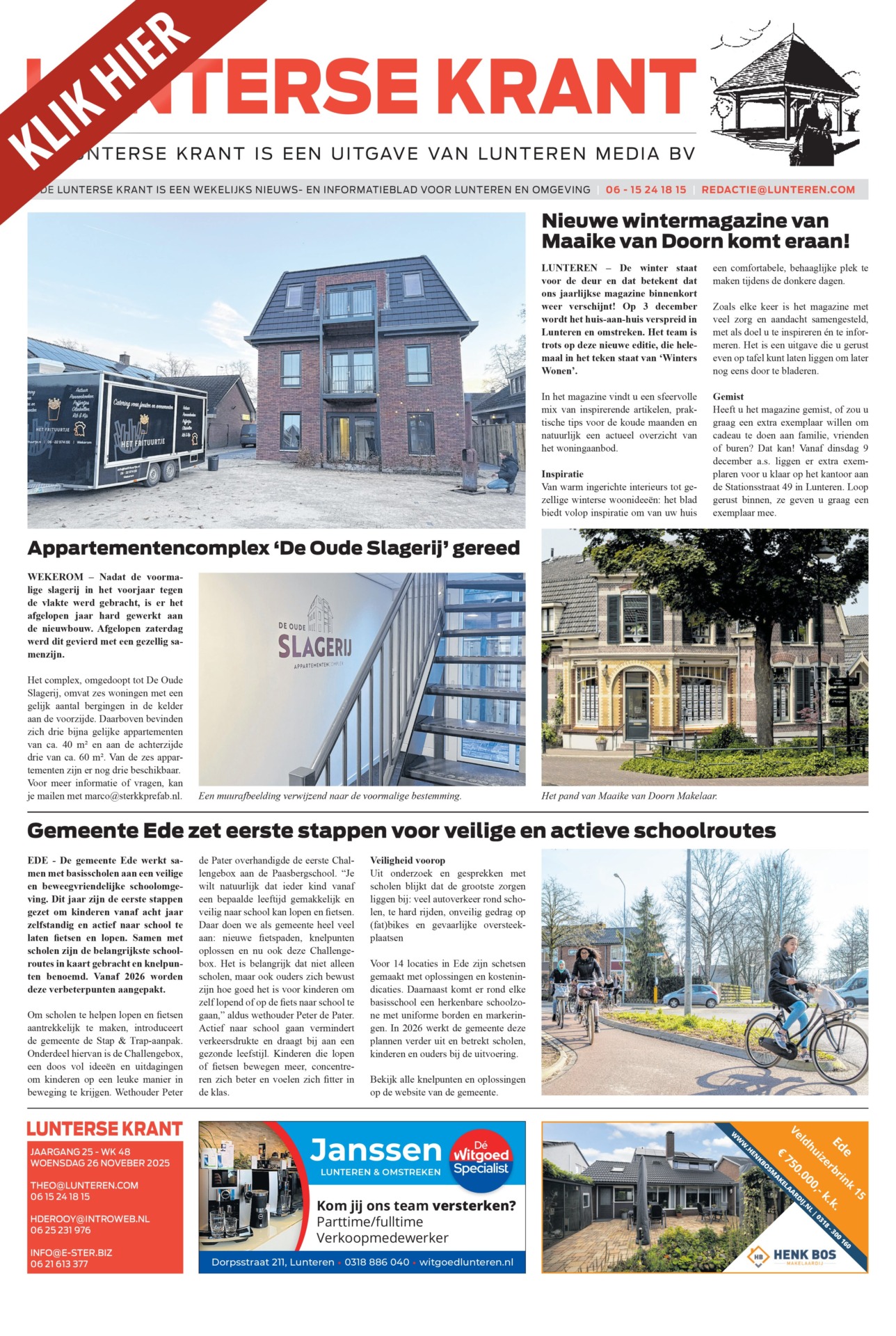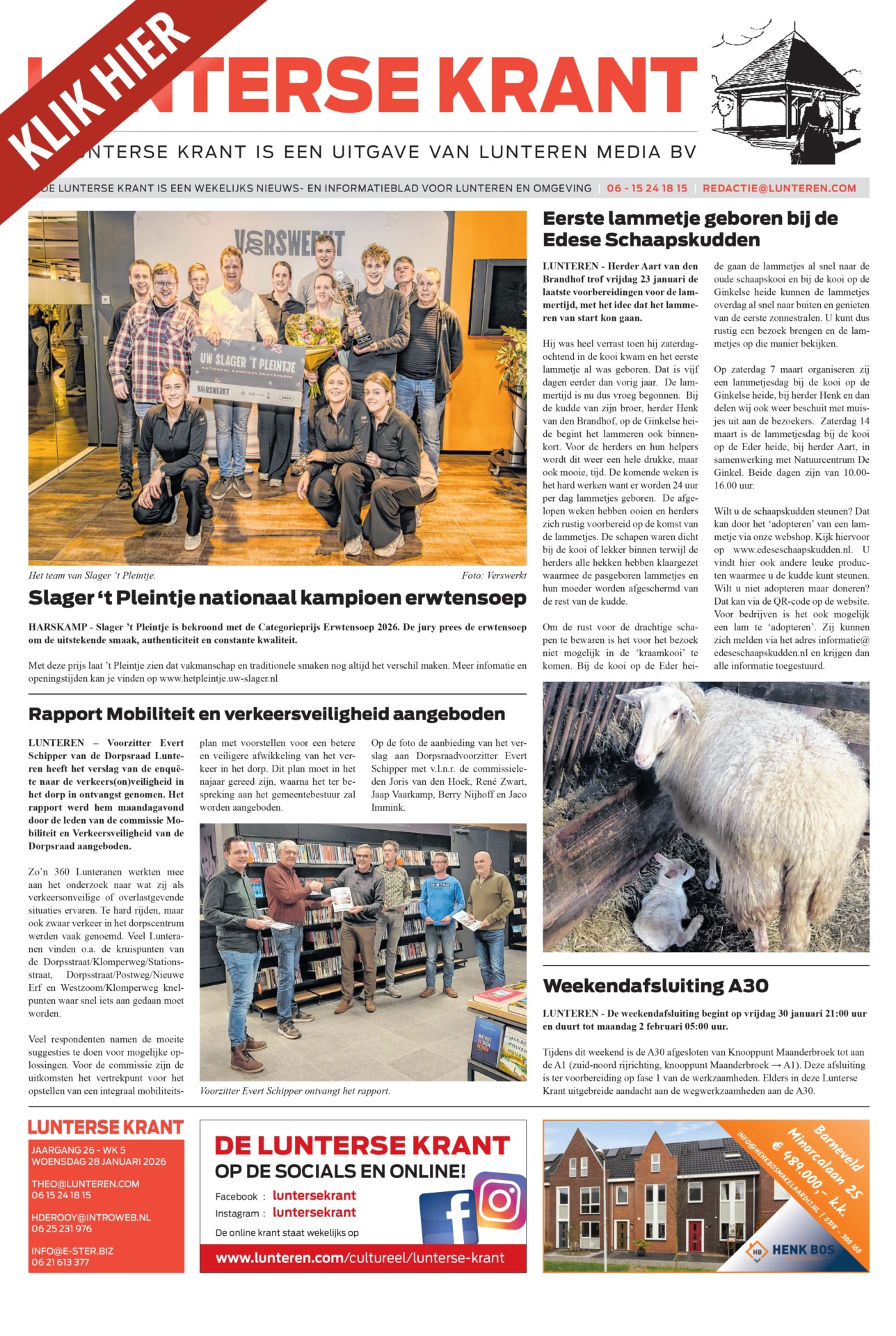 De Lunterse Krant verschijnt wekelijks op woensdag. Uiteraard in Lunteren en in de wijk Kernhem, De Klomp, Ederveen, De Valk, Wekerom, Otterlo en Harskamp. En in de buitengebieden van de betreffende dorpen. De Lunterse Krant is ook af te halen op ongeveer 25 locaties. Zoals de Esso tankstations, bijna alle supermarkten, Het Westhoffhuis, De Honskamp, De Lunterse Beek, Viskraam Fieret, De Readshop, Lokaal 17 te Otterlo, Plus Ederveen & Harskamp. Veel leesplezier!