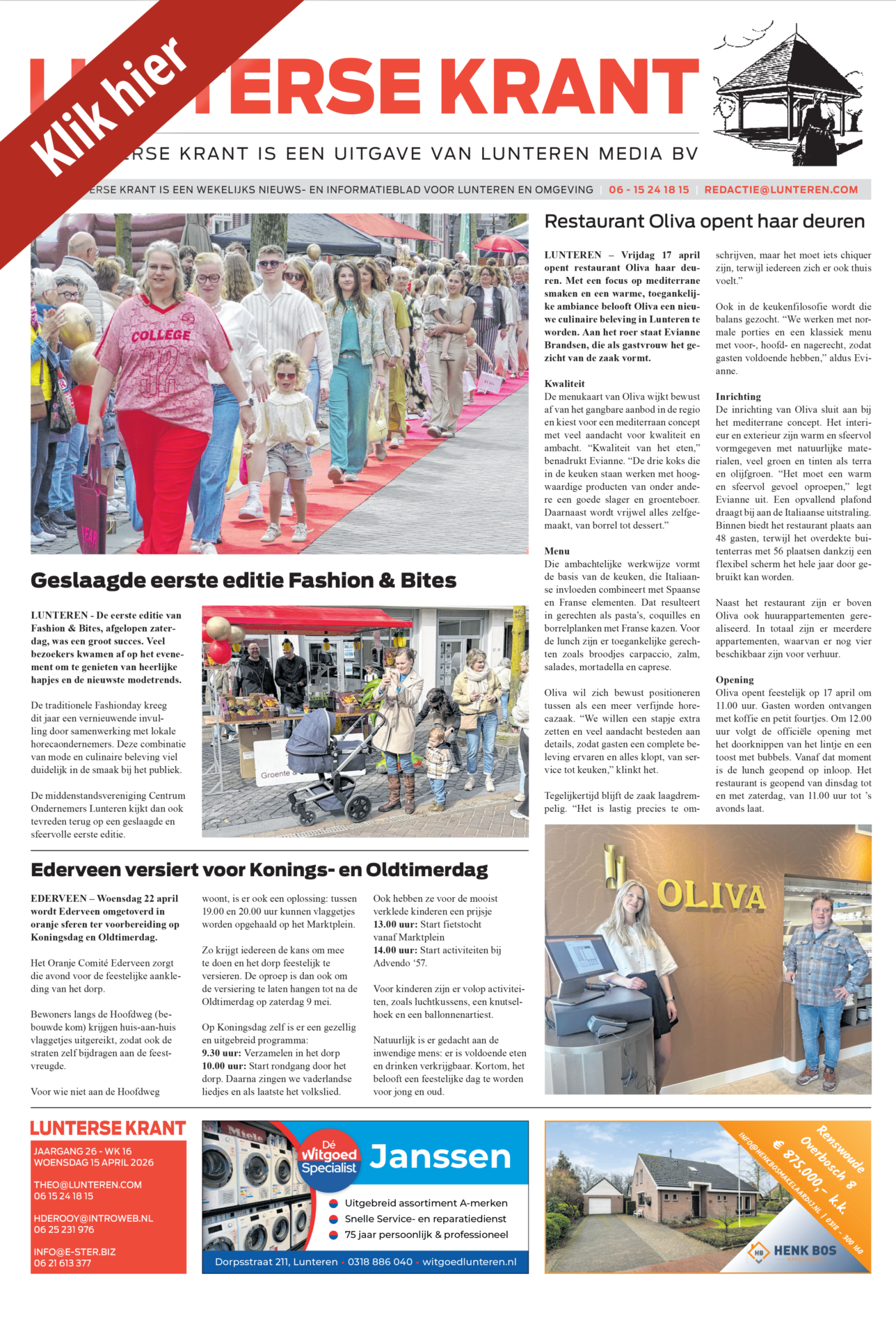 De Lunterse Krant verschijnt wekelijks op woensdag. Uiteraard in Lunteren en in de wijk Kernhem, De Klomp, Ederveen, De Valk, Wekerom, Otterlo en Harskamp. En in de buitengebieden van de betreffende dorpen. De Lunterse Krant is ook af te halen op ongeveer 25 locaties. Zoals de Esso tankstations, bijna alle supermarkten, Het Westhoffhuis, De Honskamp, De Lunterse Beek, Viskraam Fieret, De Readshop, Lokaal 17 te Otterlo, Plus Ederveen & Harskamp. Veel leesplezier!