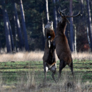 “Plotseling zagen we aan de rand van het bos op de wildweide, dat een hert die zijn gewei al had afgeworpen, uitgedaagd werd door een jonger hert, die het gewei nog op z’n kop had en zo wordt de rangorde bepaald. Dit wordt ook wel ‘lepelen’ genoemd!”