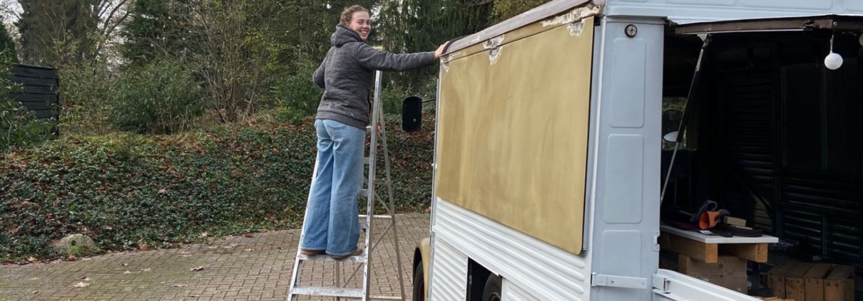 De ‘we’ slaat op haar vader, die zijn dochter Kim met raad en daad terzijde staat. Want er moest veel gebeuren aan de bus uit 1975 en daarin was hij een dankbare hulp. De weken en maanden van schuren, plamuren, grondlakken en verven zijn voorbij. De inrichting is ook zo goed als klaar. Het rijden met een Citroën HY 1600-bus uit 1975 heeft ook zo zijn uitdagingen. “Er zit geen stuurbekrachtiging op en ook rembekrachtiging ontbreekt. Er zijn maar drie versnellingen en het schakelen is iets wat je moet leren. Van 0 naar 100 km/u doe je in meer dan een minuut!” Kim ziet er de humor wel van in.