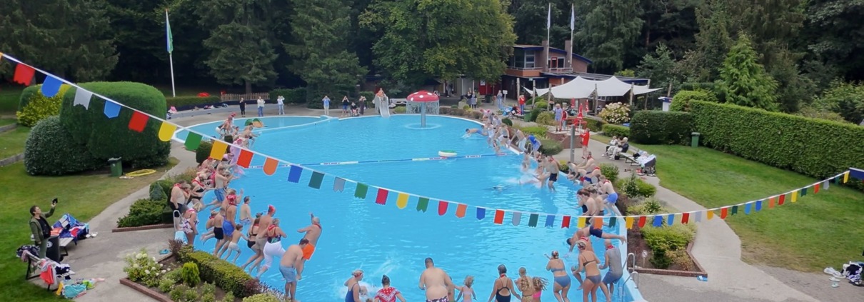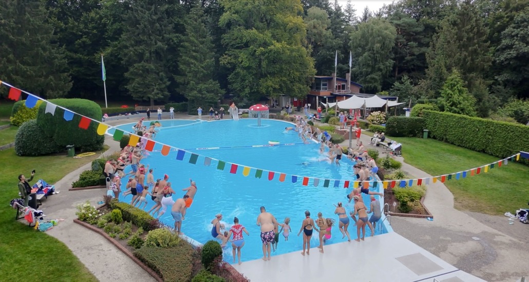 Na een lekker bakkie koffie/thee of liemenaoje mit mekaor, moste we verzaomele um ‘t bad. Onze ‘eige’ Gaartjan dee de oopening. Ja ‘eige’ want hij zwemt ok bar veul baontjes (en het ok veul praotjes) alle dag in ‘t Bosbad! Gaartjan gaf ‘t sein um of te telle veur de 3e verfrissende ‘OLD-duuk’. Wat een spektakel weer! Kiek veur meer ploatjes mer op je tillefoon. “De OLD-duuk stelt ‘niks’ veur, maar je bin d’r wel vrolek, fris en fruiteg deur”