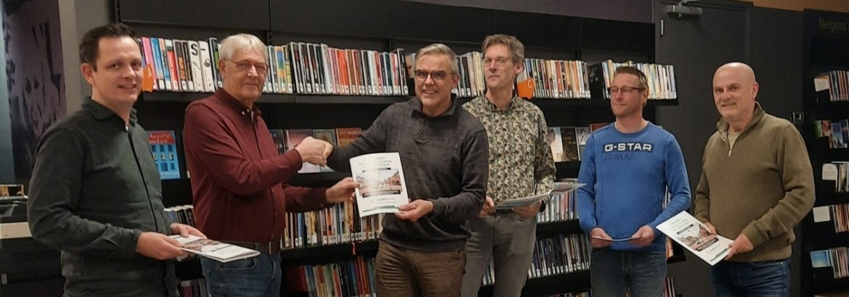 Op de foto de aanbieding van het verslag aan Dorpsraadvoorzitter Evert Schipper met v.l.n.r. de commissieleden Joris van den Hoek, René Zwart, Jaap Vaarkamp, Berry Nijhoff en Jaco Immink.