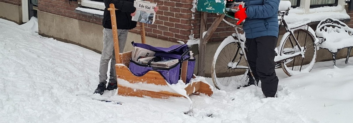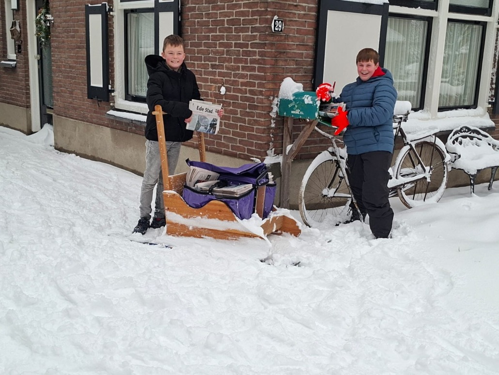 Om deze gevaren te omzeilen, bedachten diverse kranten- en postbezorgers creatieve oplossingen. Jesse en Justus op bovenstaande foto hadden een krantenduwslee gemaakt.